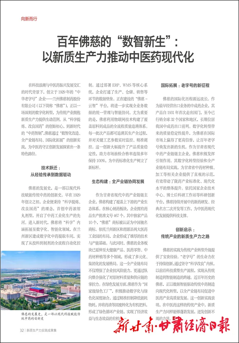 近日,一篇题为《匠心筑百年创新向未来——佛慈数智化转型赋能中医药现代化高质量发展》的重磅文章,被《新甘肃》《甘肃经济网》《甘肃经济日报》《今日头条》等多家主流媒体广泛转发,引发了行业内外的高度关注和点赞。